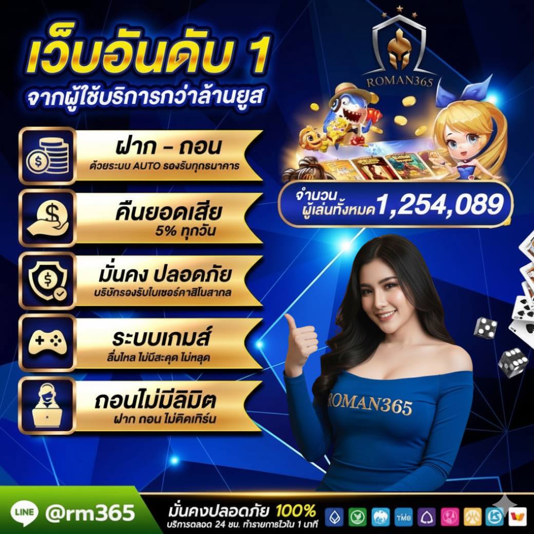 ROMAN365 เป็นแบรนด์ชั้นนำของเว็บเดิมพันกีฬา เว็บไชต์คาสิโนที่เล่นง่ายได้เงินจริง ด้วยระบบ ฝาก- ถอน ออโต้ภายใน 1 นาทีเท่านั้น สล็อตแตกง่ายสุดๆ มาแรงที่สุดในชั่วโมงนี้เพราะระบบของเราไม่ต้องดาวน์โหลดแอป ไม่ต้อง Copy รหัสให้ยุ่งยากอีกต่อไป เพราะคาสิโนของเราสามารถเล่นผ่านหน้าเว็บไซต์ได้เลยทันที มีเกมให้เลือกเล่นหลากหลากจากค่ายดัง กับเกมส์รูปแบบใหม่ภาพกราฟฟิคสวยงามเสมือนจริง สามารถเล่นผ่านเบราเซอร์บนคอมพิวเตอร์ หรือมือถือทุกระบบ สนใจสมัครเล่นและเป็นสมาชิกกับเราติดต่อสอบถาม Call Center ได้ตลอด 24 ชม. หรือทักแชทไลน์มาเลยการันตรีในระบบและการให้บริการ ซึ่งผ่านการตรวจสอบโดยองค์การคาสิโนออนไลน์แห่งเอเชีย ซึ่งมีเว็บเราเพียงเว็บเดียวในไทย ที่ผ่านมาตรฐานนี้ นั่นทำให้คุณสามารถมั่นใจได้อย่างแน่นอนว่า คุณได้เล่นคาสิโนออนไลน์ในระบบเว็บที่ดีที่สุดของไทย ราคาน้ำดีที่สุด การบริการที่รวดเร็วที่สุด ด้วยระบบที่ทันสมัยและดีที่สุด มาตรฐานระดับสากล มีสำนักงานใหญ่มั่นคงที่สุดในเอเชีย ทำให้มั่นใจได้ว่าเป็นเว็บคาสิโนออนไลน์ที่ปลอดภัยและมั่นคงอย่างแน่นอน เลือกเว็บเดิมพันอย่างมั่นใจ ใช้บริการ Roman365 สุดยอดเว็บเดิมพันในประเทศไทย โปรโมชั่นดีที่สุด ระบบดีที่สุด และมีกิจกรรมแจกเงินรางวัลที่มากที่สุดในไทย